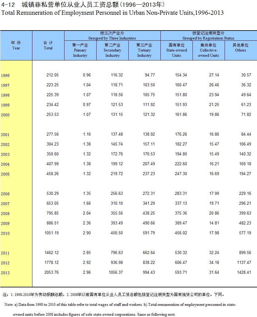 4-12 �����˽Ӫ��λ��ҵ��Ա�����ܶ�(1996-2013��)