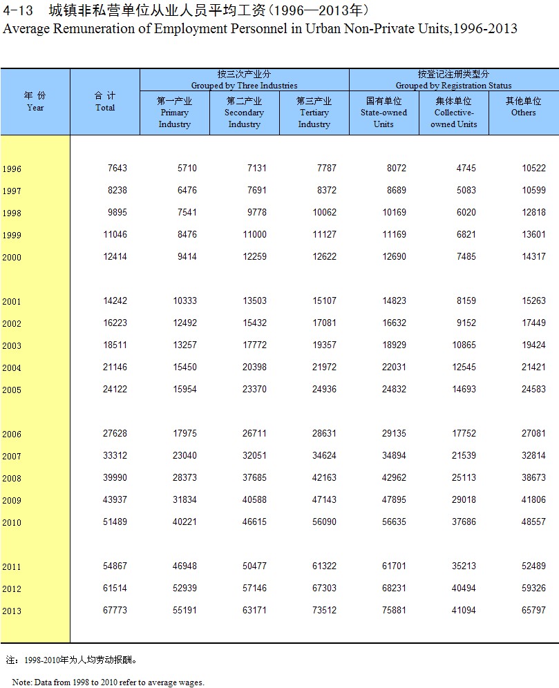 4-13 �����˽Ӫ��λ��ҵ��Աƽ������(1996-2013��)