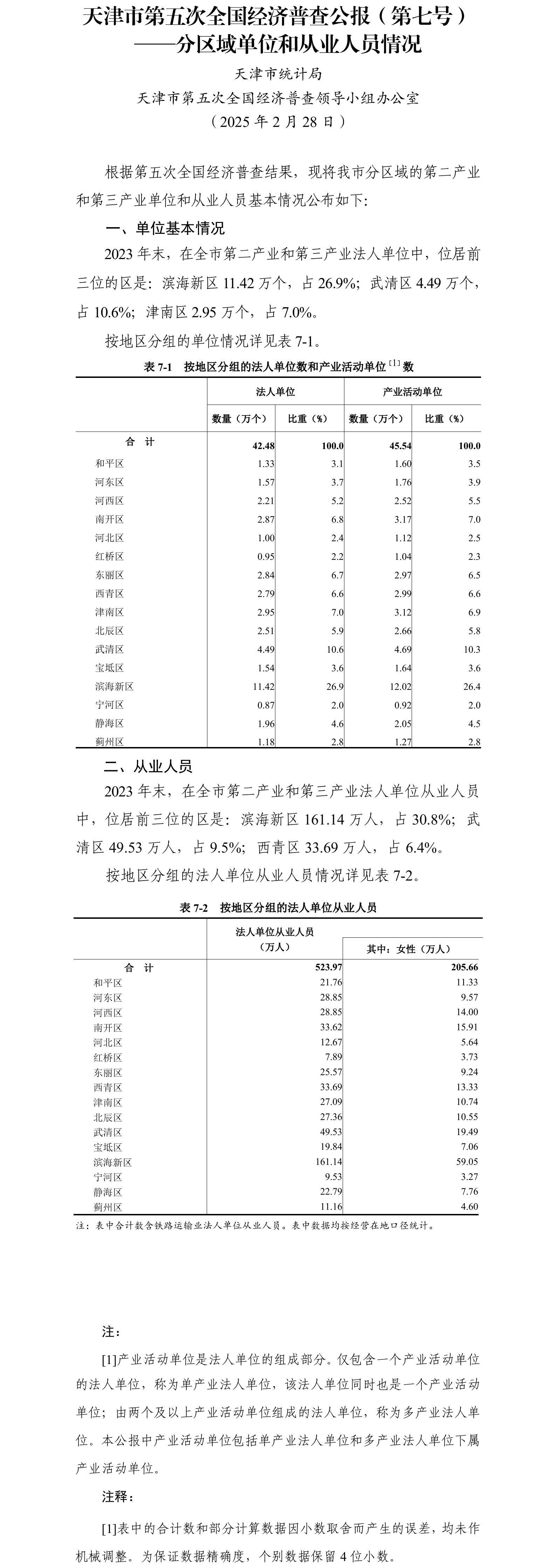 天津市第五次全国经济普查公报(第七号) ——分区域单位和从业人员情况